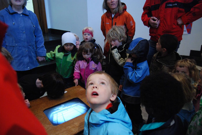 A kindergarten class tour. The children realized that the person in the monitor was actually inside the window above.